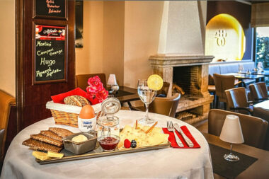 2 Semmeln, Butter, Marmelade, gekochter Schinken, Bauernschinken, Wurst, Käse, Müsli, Rührei, O-Saft